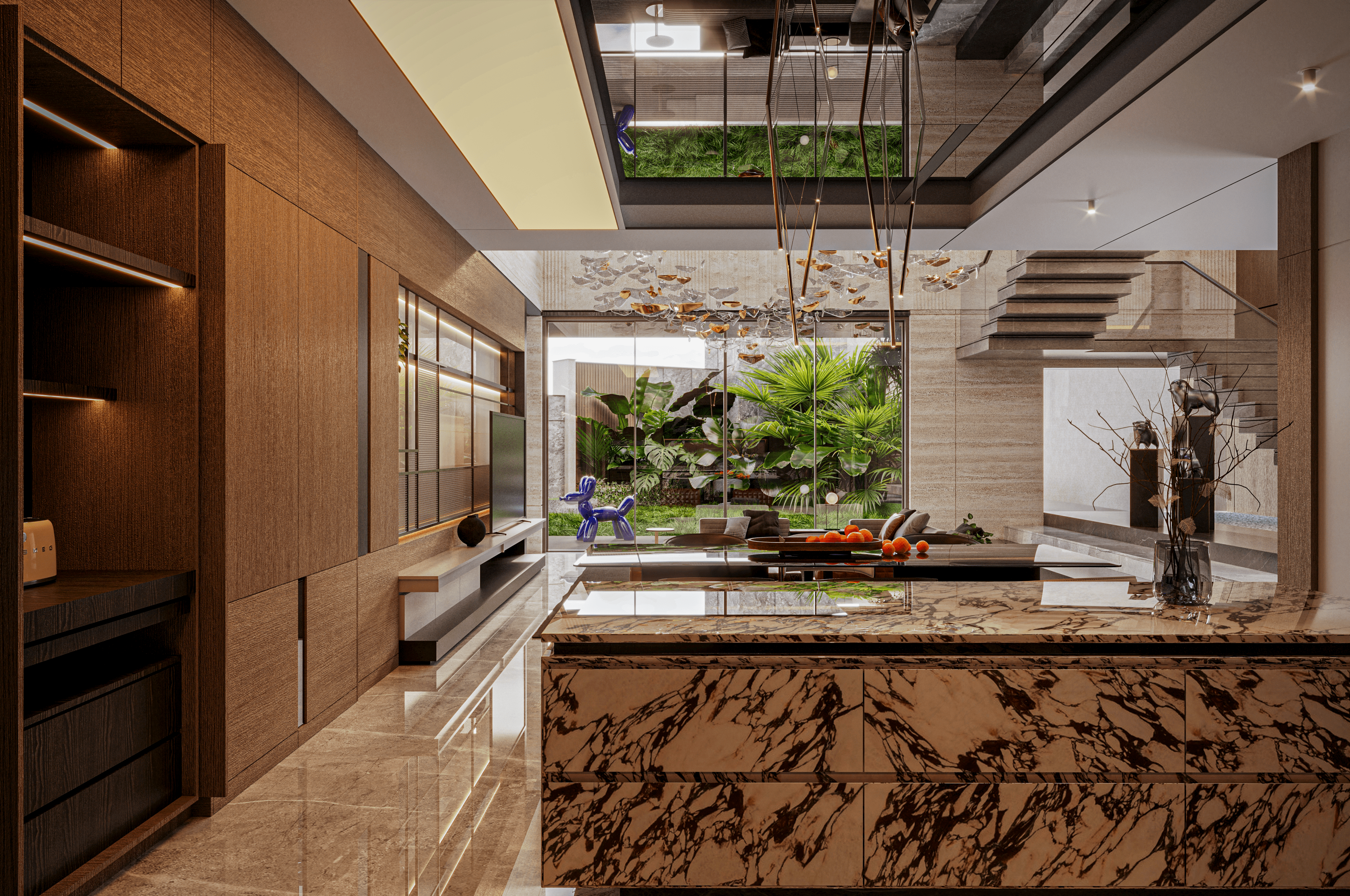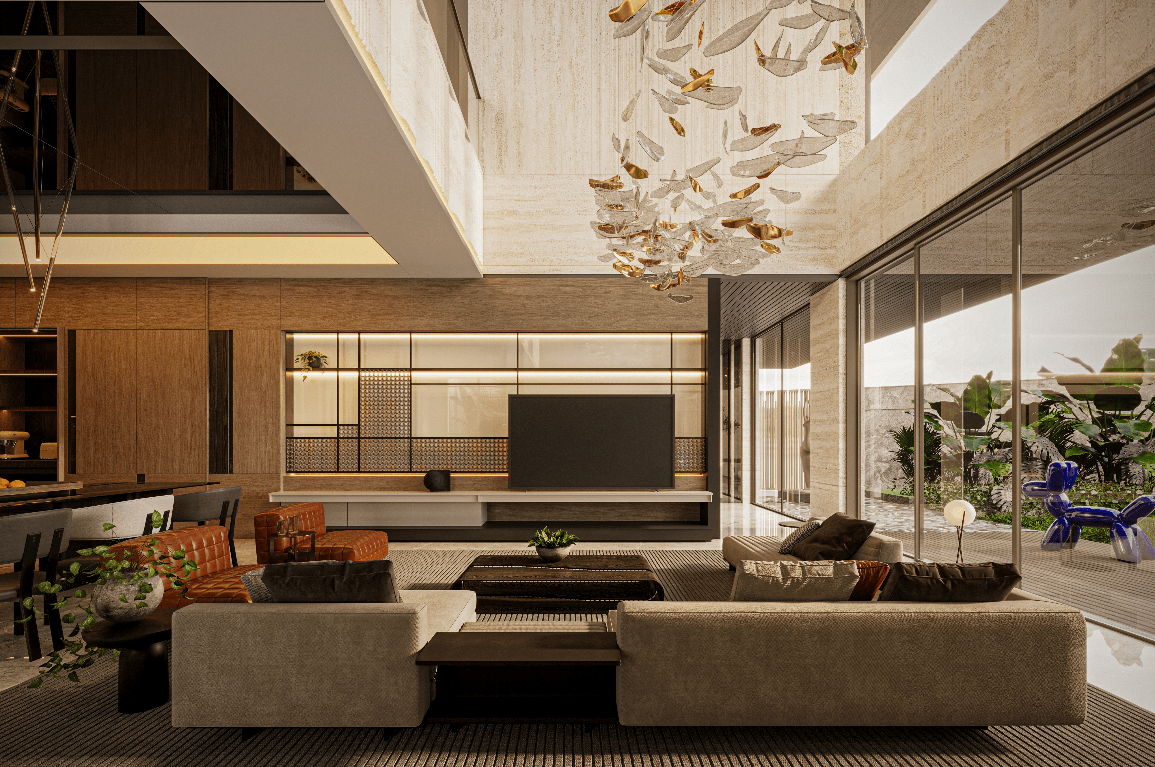 Paletnya warm neutral—beige, taupe, kayu hangat, marble dengan urat dramatis—dipadukan aksen kulit cognac dan dekor seni kontemporer seperti patung anjing balon warna biru elektrik.