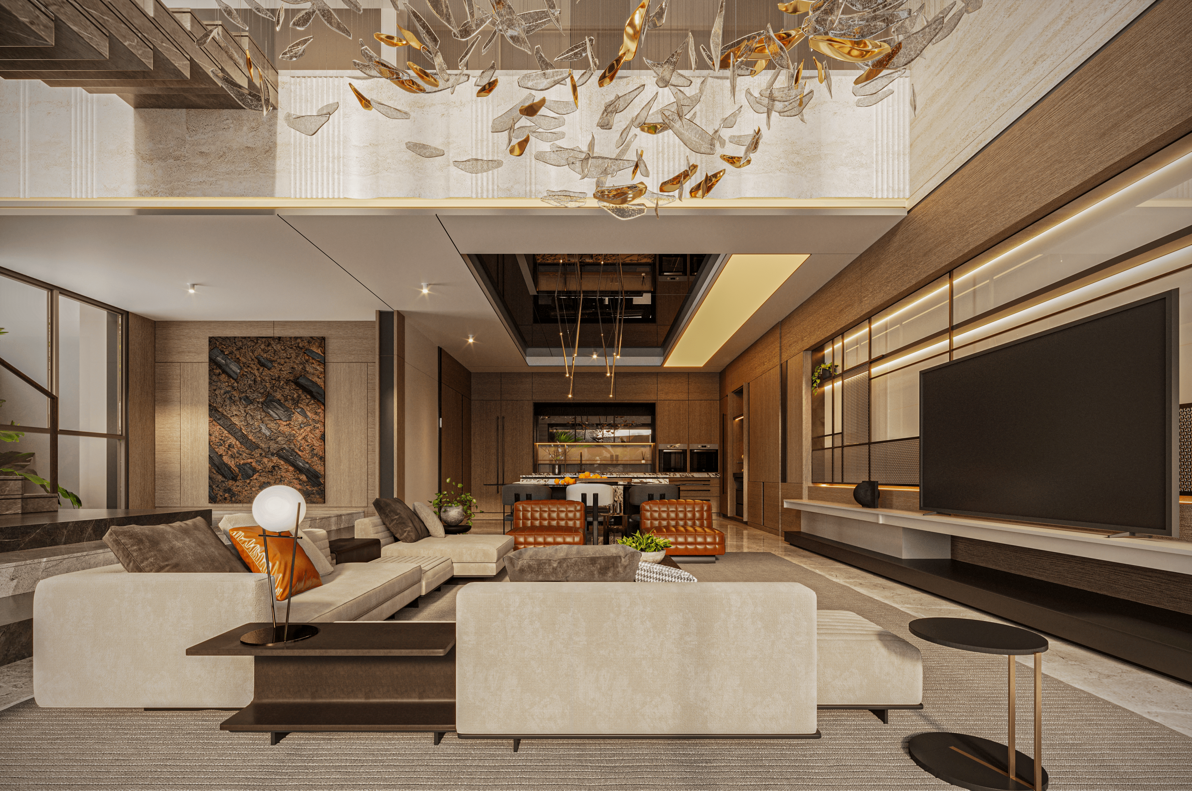 Living room double height dengan chandelier dramatis menggantung di tengah atrium.
