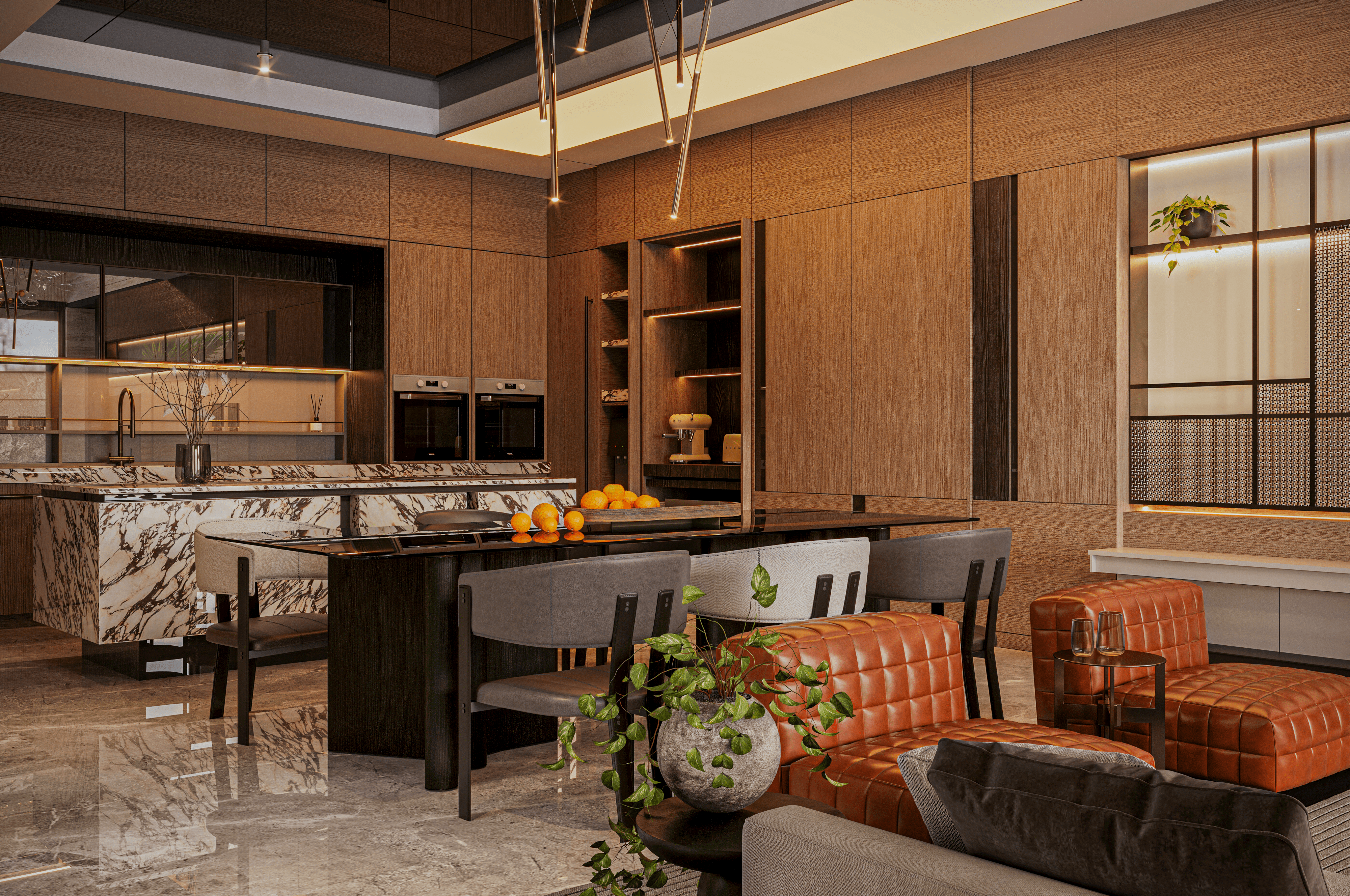 Metal tipis dan kaca pada rak dan partisi memperkenalkan garis-garis modern yang ringan, menjaga komposisi tetap kontemporer, tidak berat.