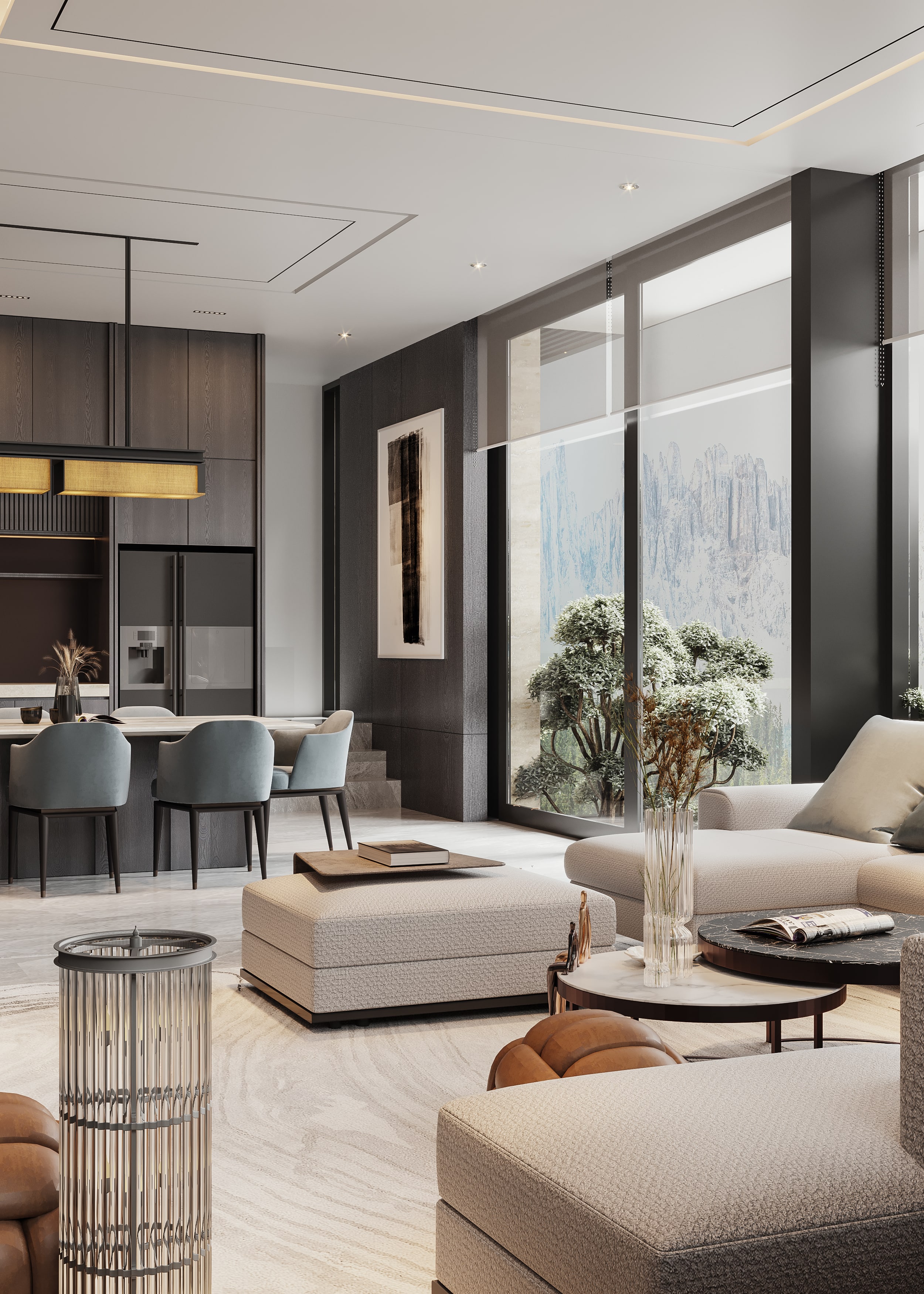 Di sisi living, sofa dan ottoman krem lembut membentuk komposisi santai dengan coffee table bundar. Tekstur kainnya ada sedikit grain, jadi nyaman, tidak mudah kelihatan kusut.