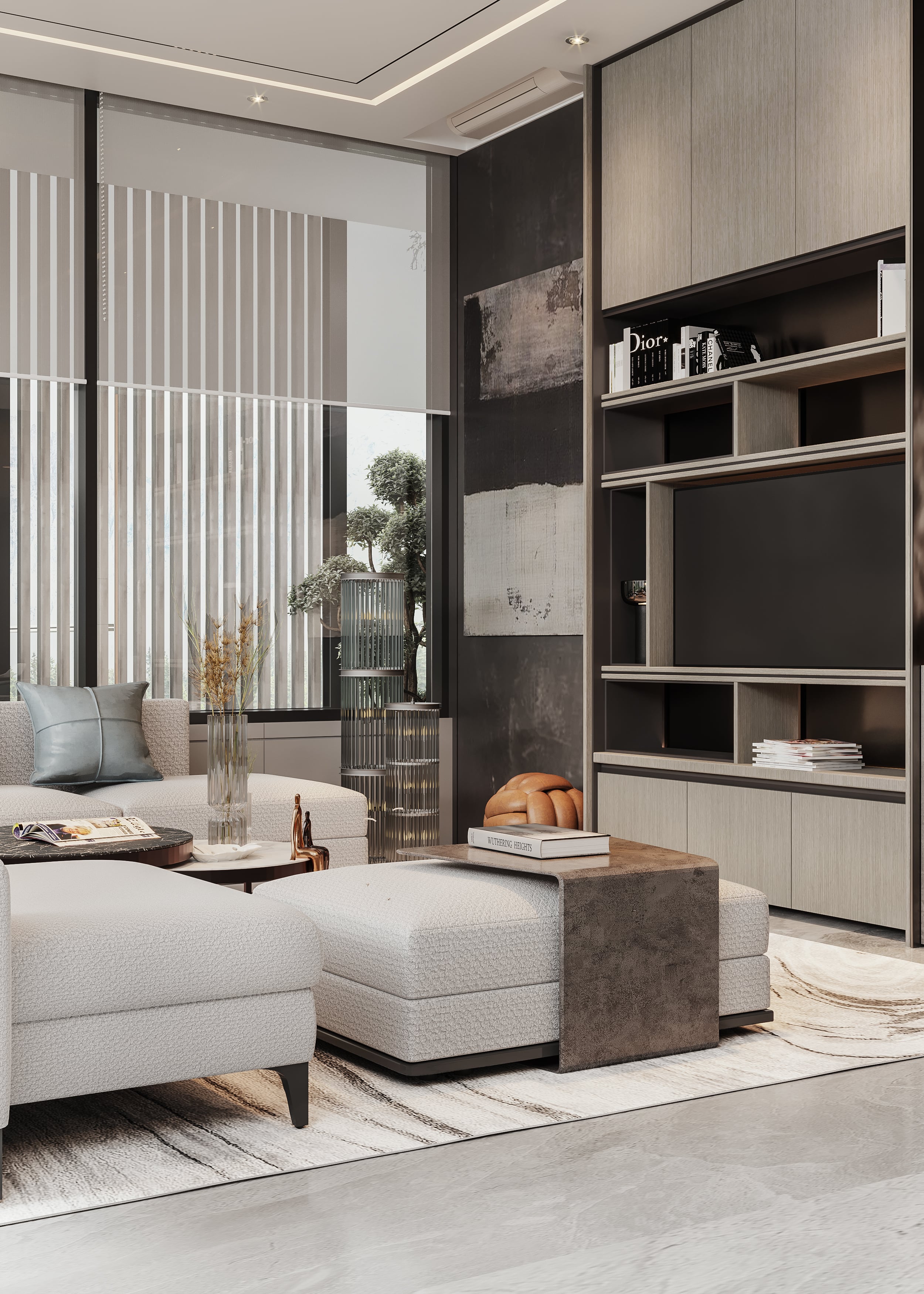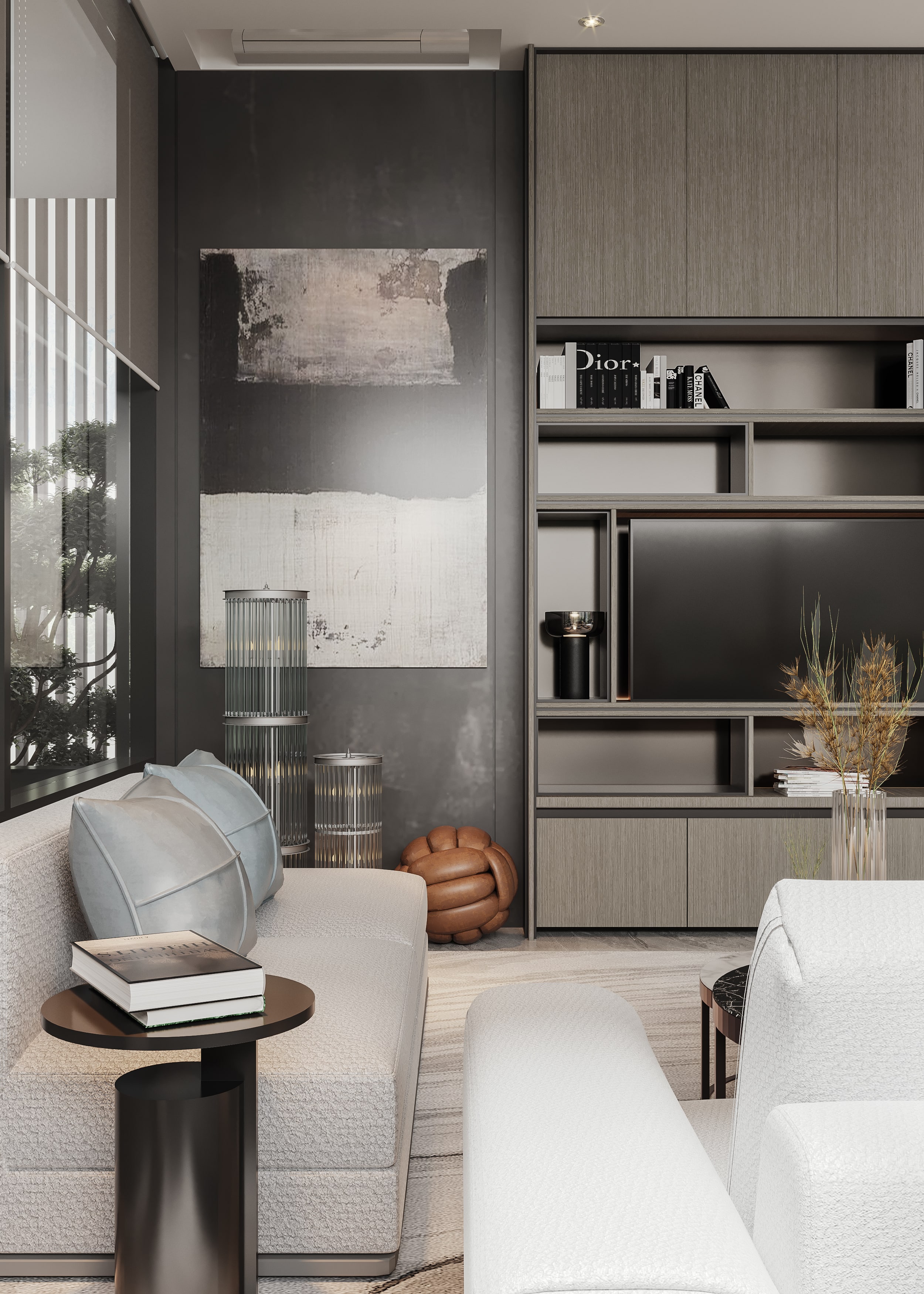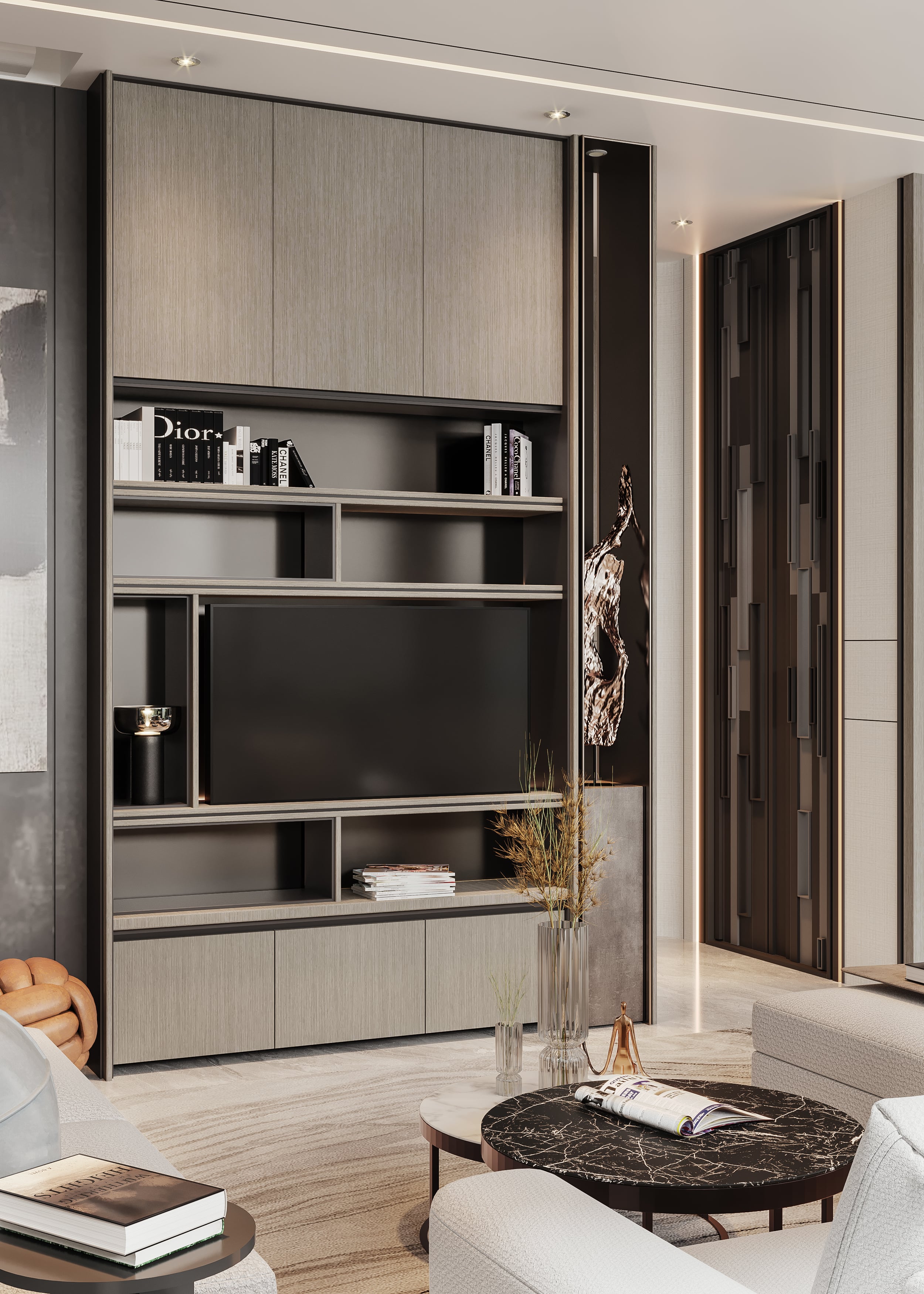 Dinding cabinetry berwarna kayu abu muda dan panel gelap menyembunyikan storage dengan sangat halus. Rak terbuka hanya menampilkan sedikit buku dan dekor, bukan penuh barang.