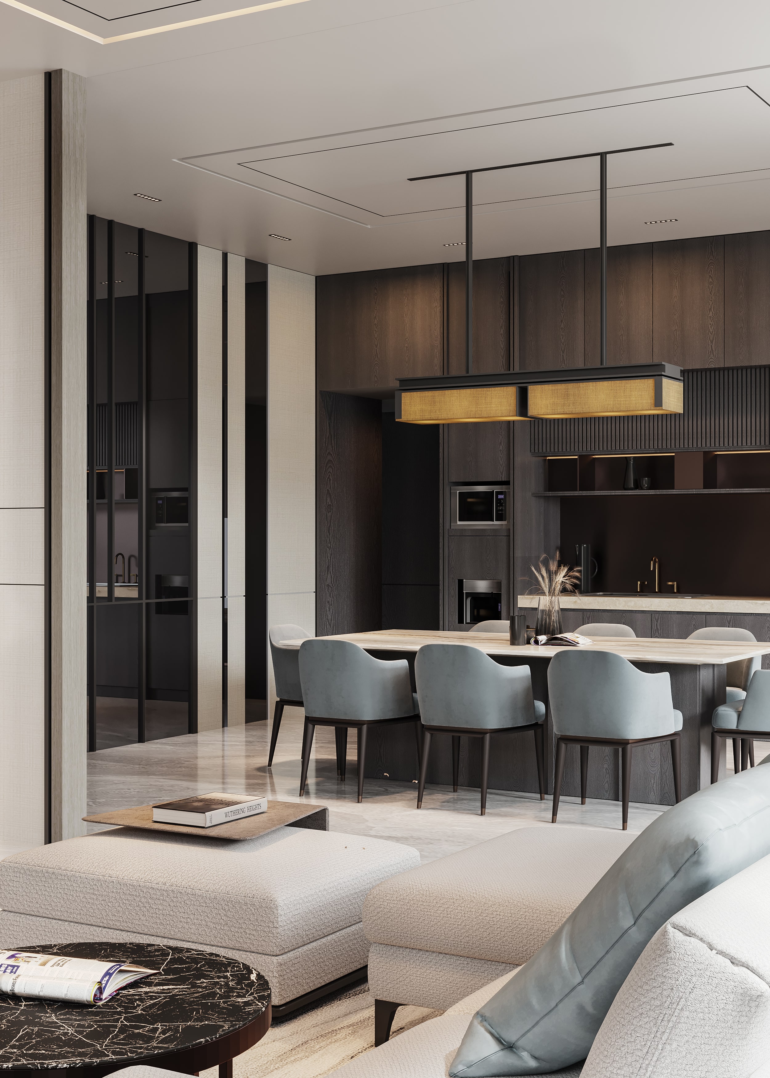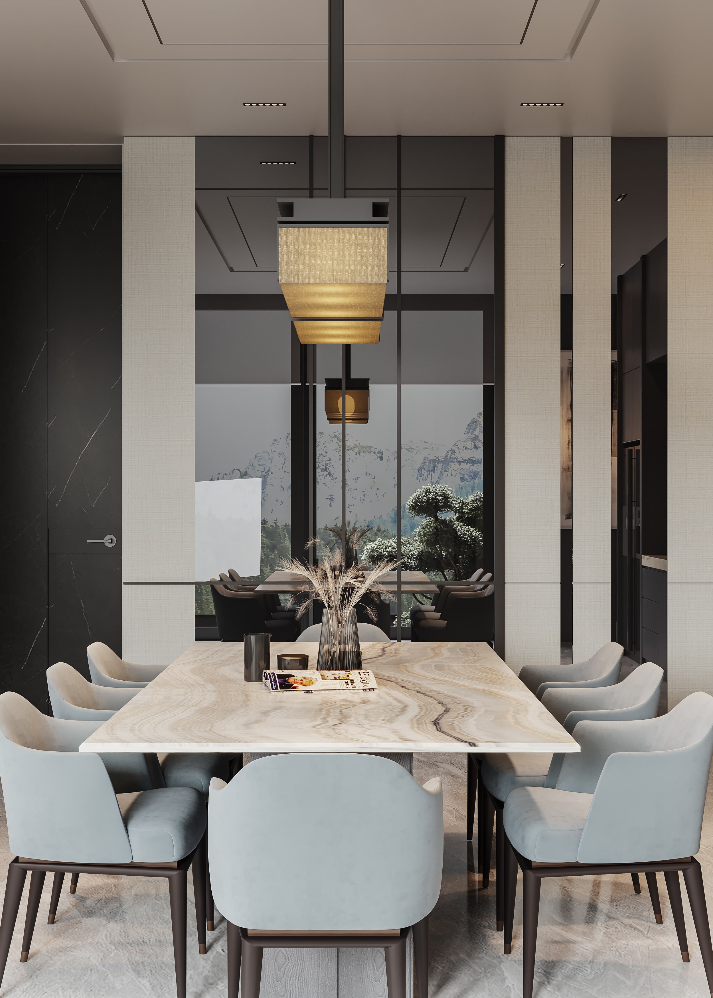Karpet dengan pattern lembut mengikuti urat batu di meja, menyatukan seluruh area.