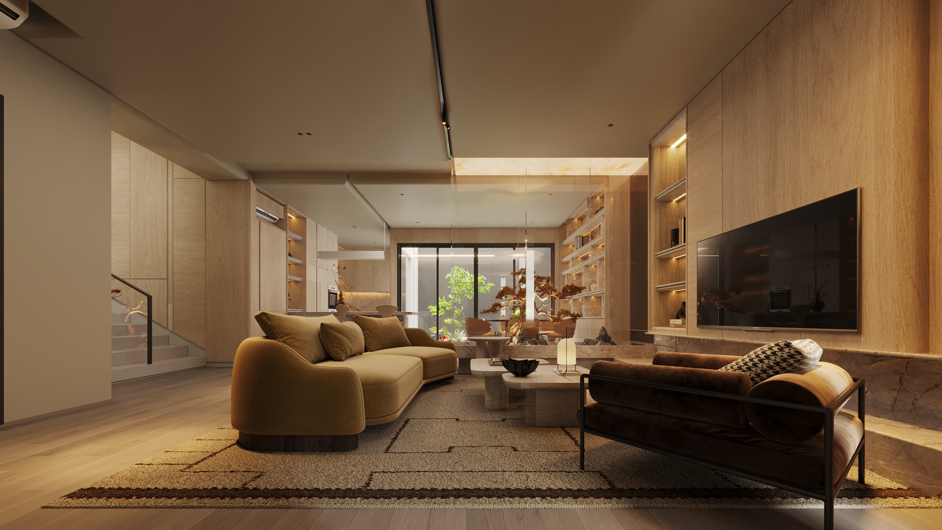 Living area berada di tengah, menghadap TV dan taman bonsai di balik panel kaca. Sofa melengkung sengaja dipilih agar aliran sirkulasi tetap mengalir tanpa sudut tajam.