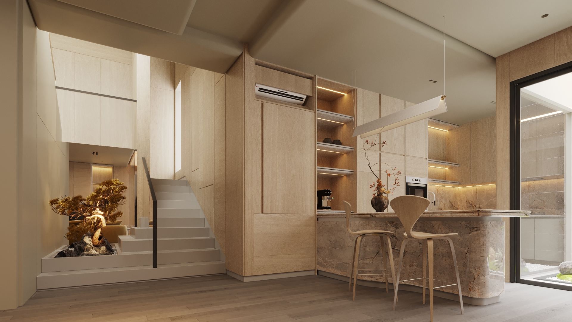 Tangga yang naik dari sisi kitchen menyambungkan lantai atas tanpa memutus visual; dinding kayu menyamarkan pintu dan panel sehingga tampak bersih.