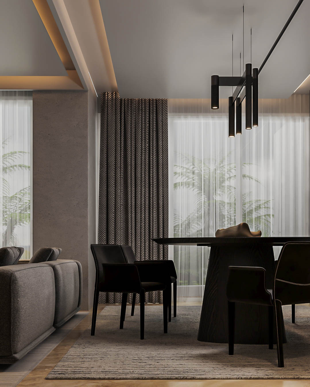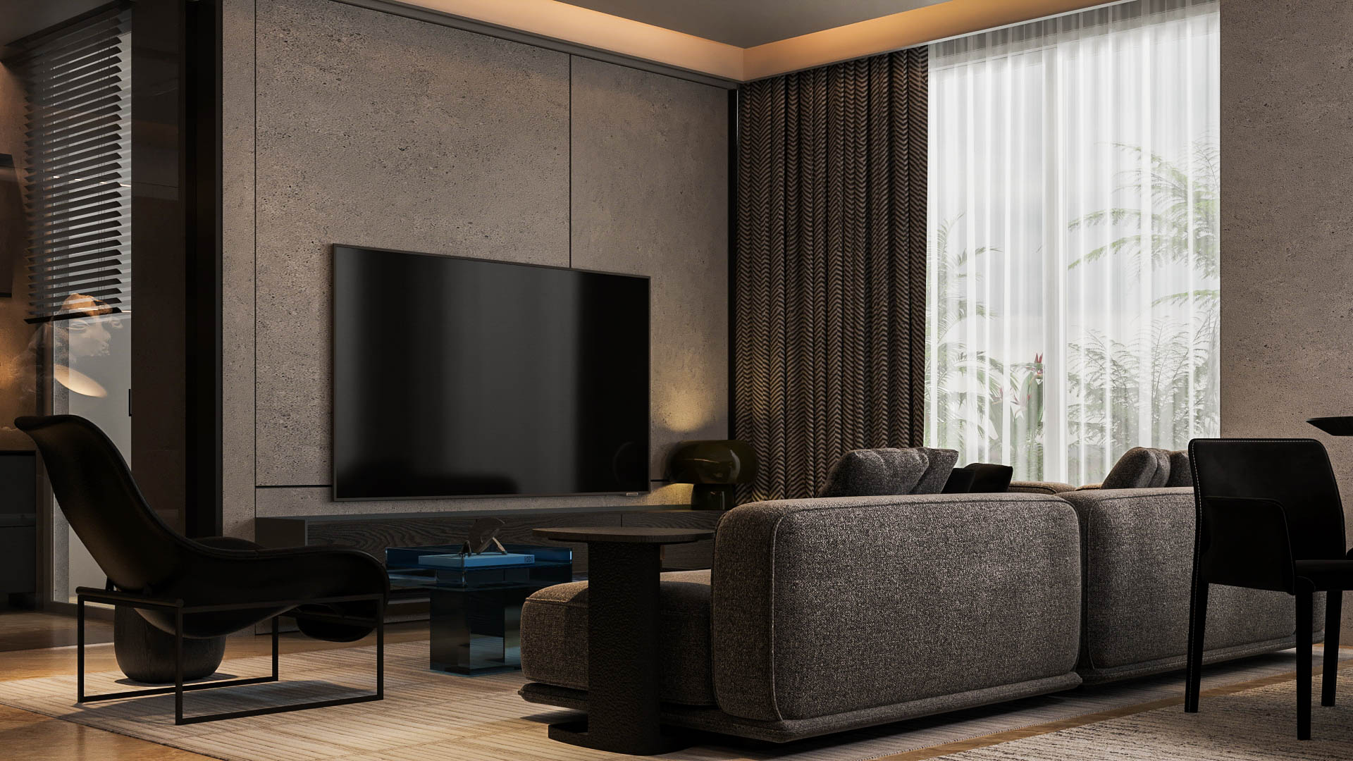 Sofa abu-abu medium, kursi hitam, dan karpet warna natural menyeimbangkan dinding yang lebih gelap, sehingga ruang tidak terasa sempit atau suram.