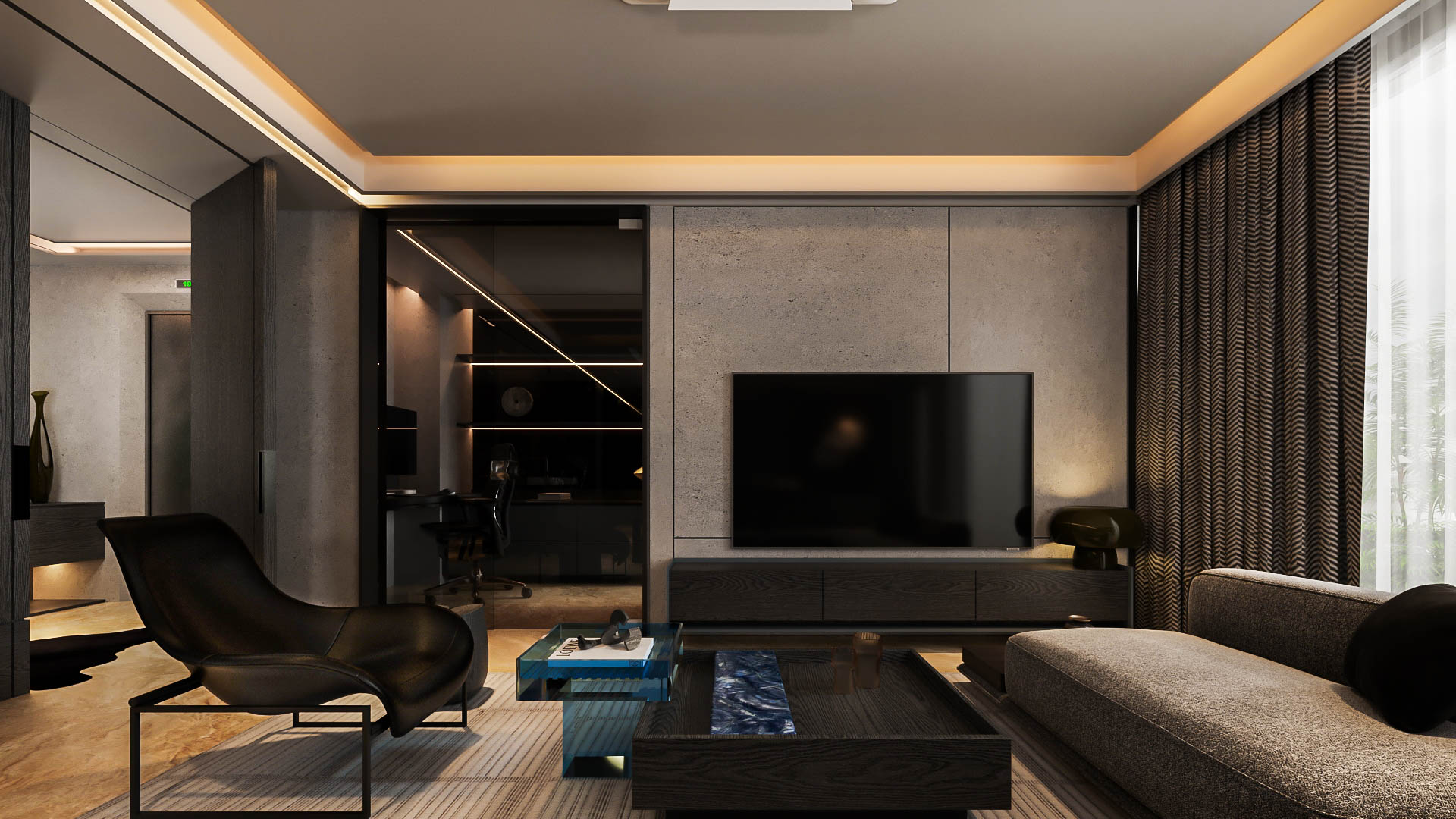 Cove light di sepanjang perimeter plafon memberi halo lembut yang menyelimuti ruang, menghilangkan bayangan keras dan membuat kayu gelap terlihat lebih kaya.