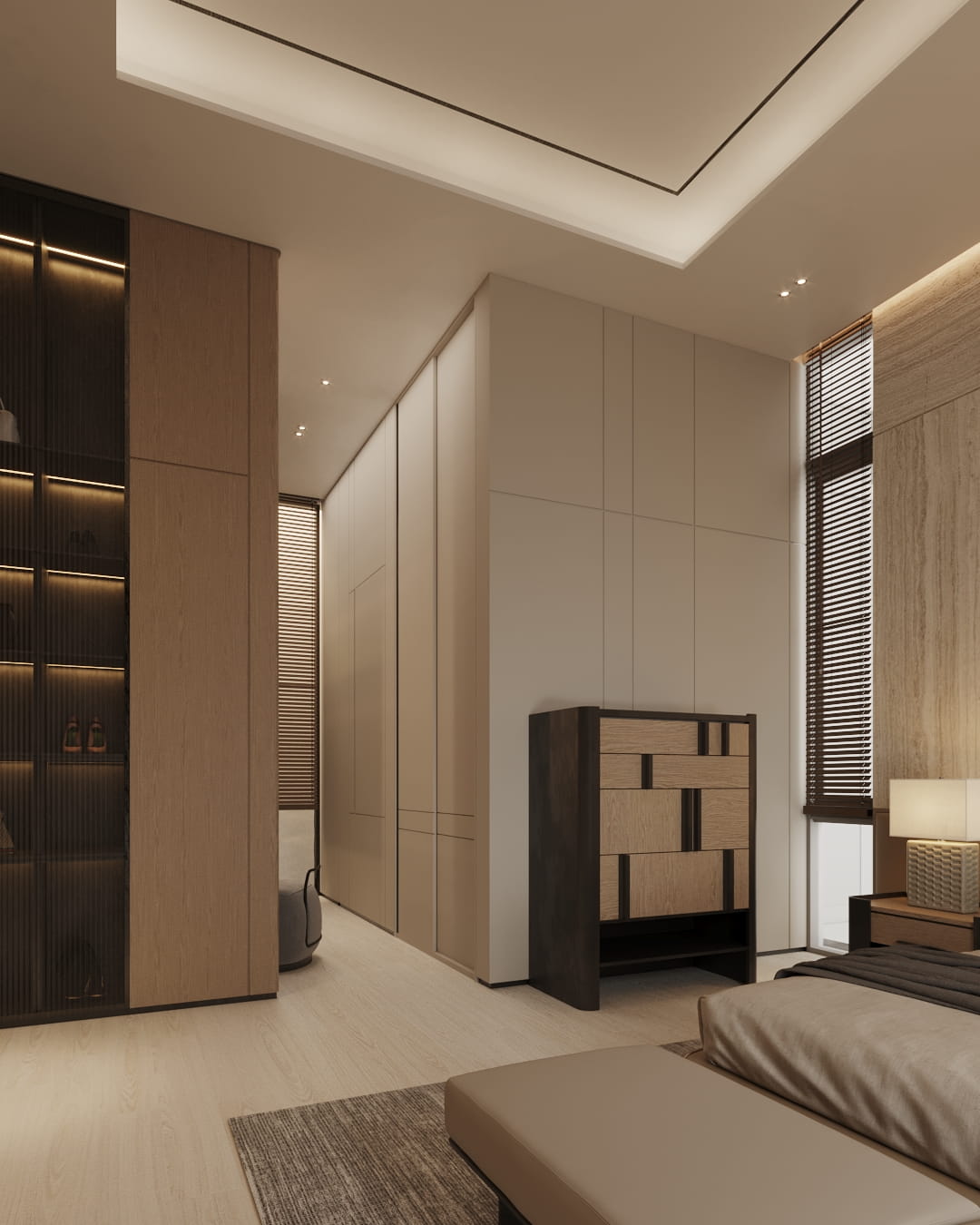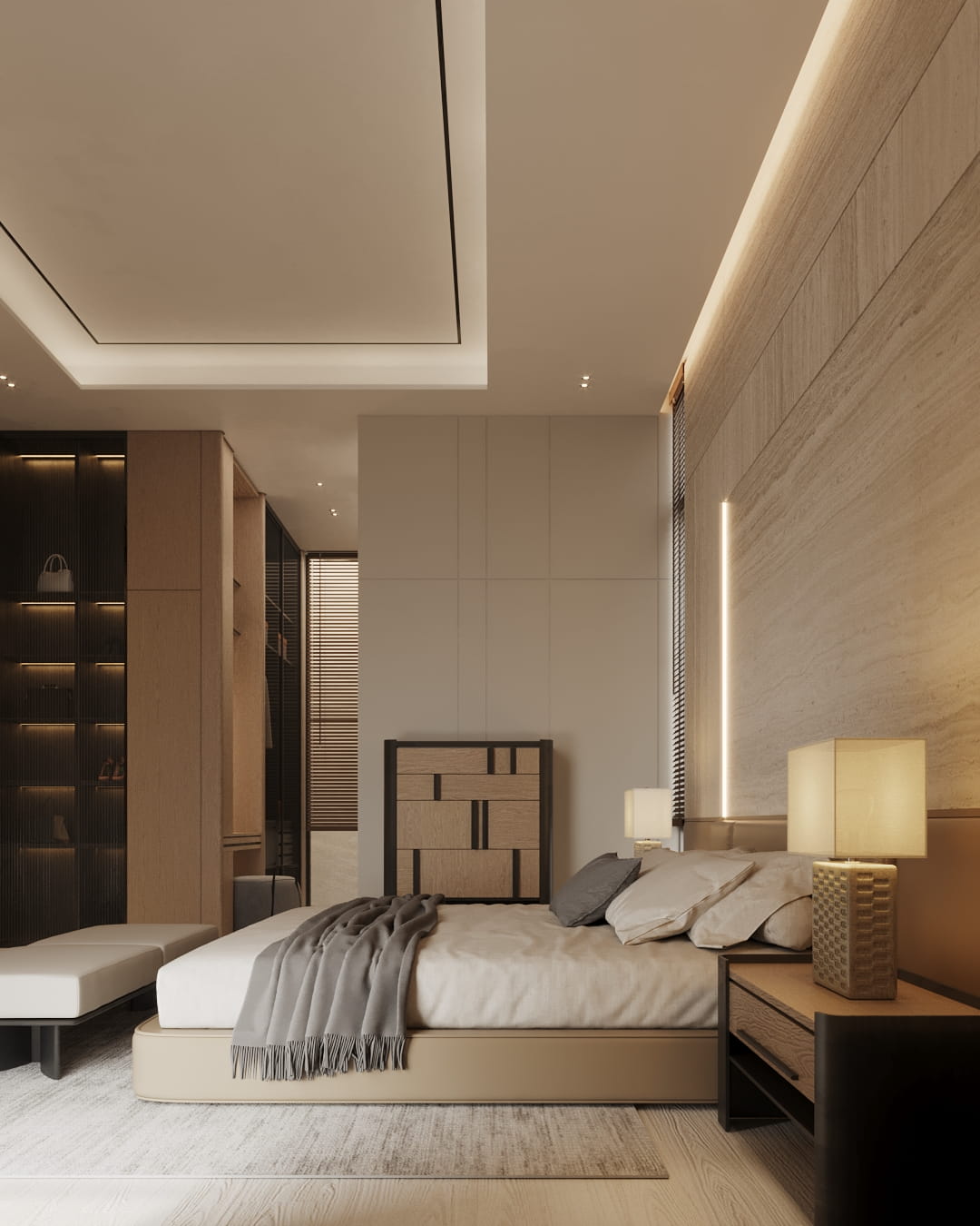 Ruang tidur ini didesain seperti private suite hotel: tenang, hangat, dan rapi. Fokusnya pada garis-garis yang bersih, panel dinding yang besar, dan pencahayaan lembut yang membingkai tempat tidur sebagai pusat perhatian.