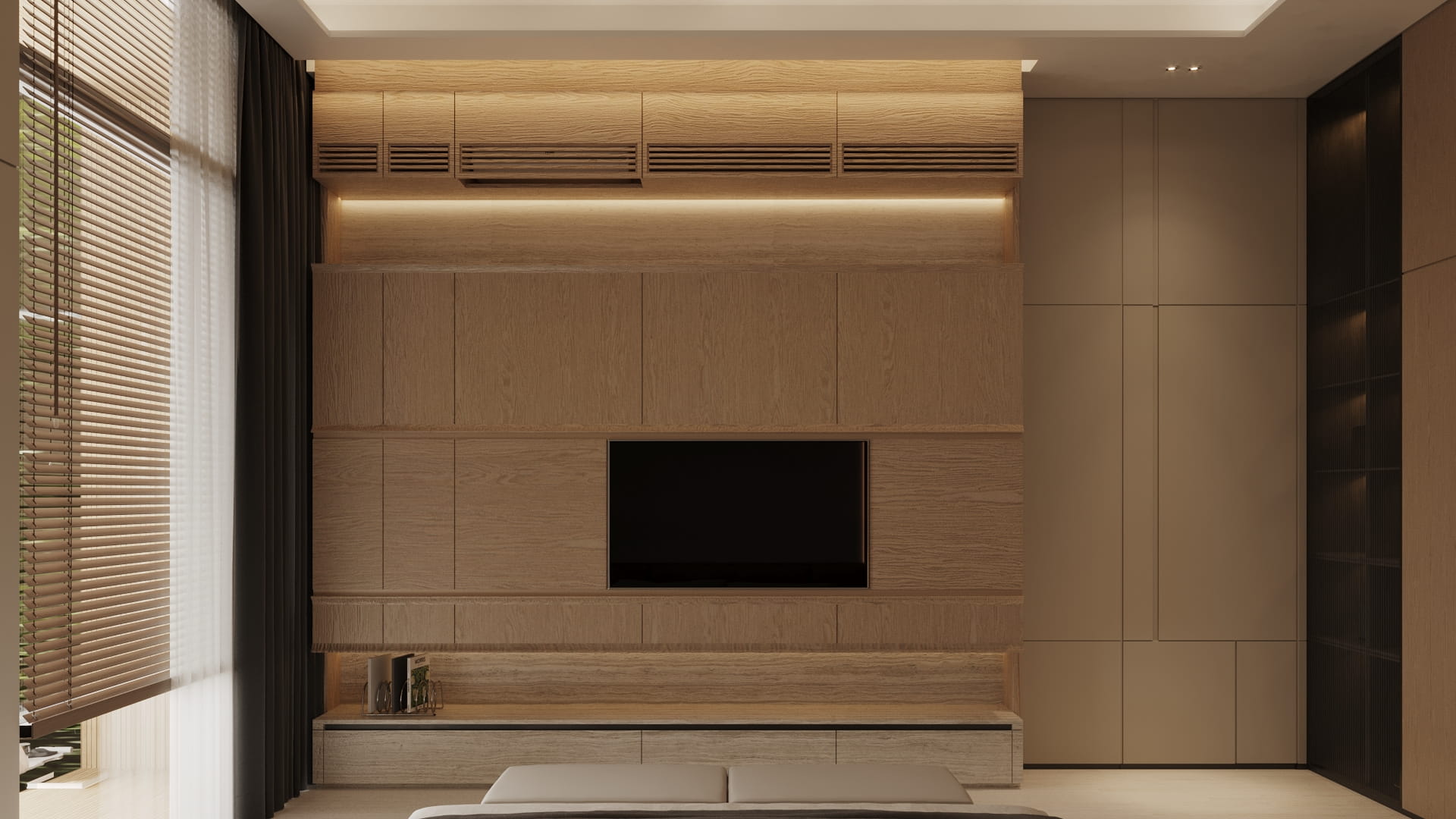 Panel dinding & TV wall: kombinasi veneer kayu oak terang dan panel cat duco beige yang halus.