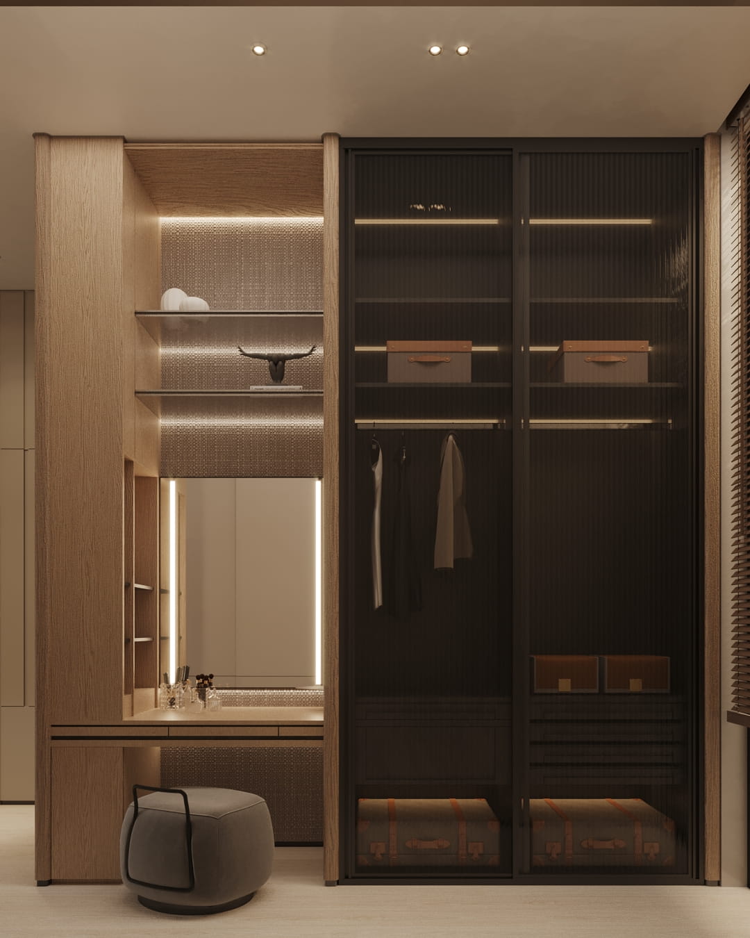 Wardrobe area menggunakan kombinasi panel tertutup dan lemari display, jadi ada ruang untuk menyimpan dan juga memamerkan item favorit.