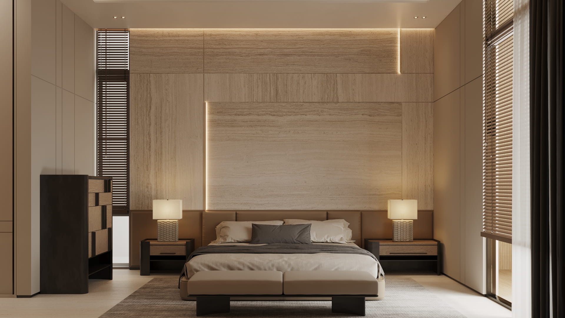 Backdrop kepala tempat tidur: panel batu / travertine motif garis alami, memberi kesan calm dan sekaligus mewah.