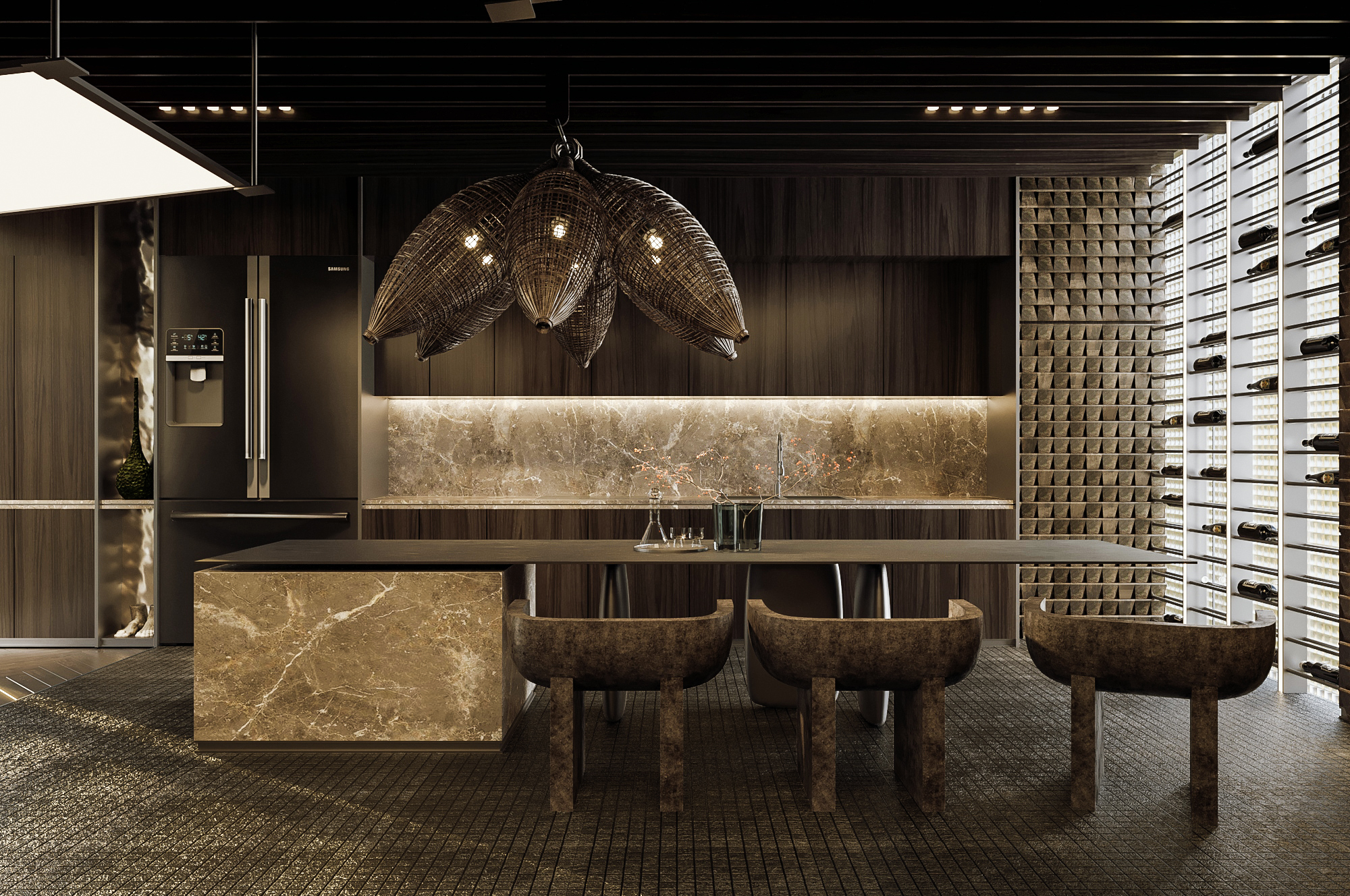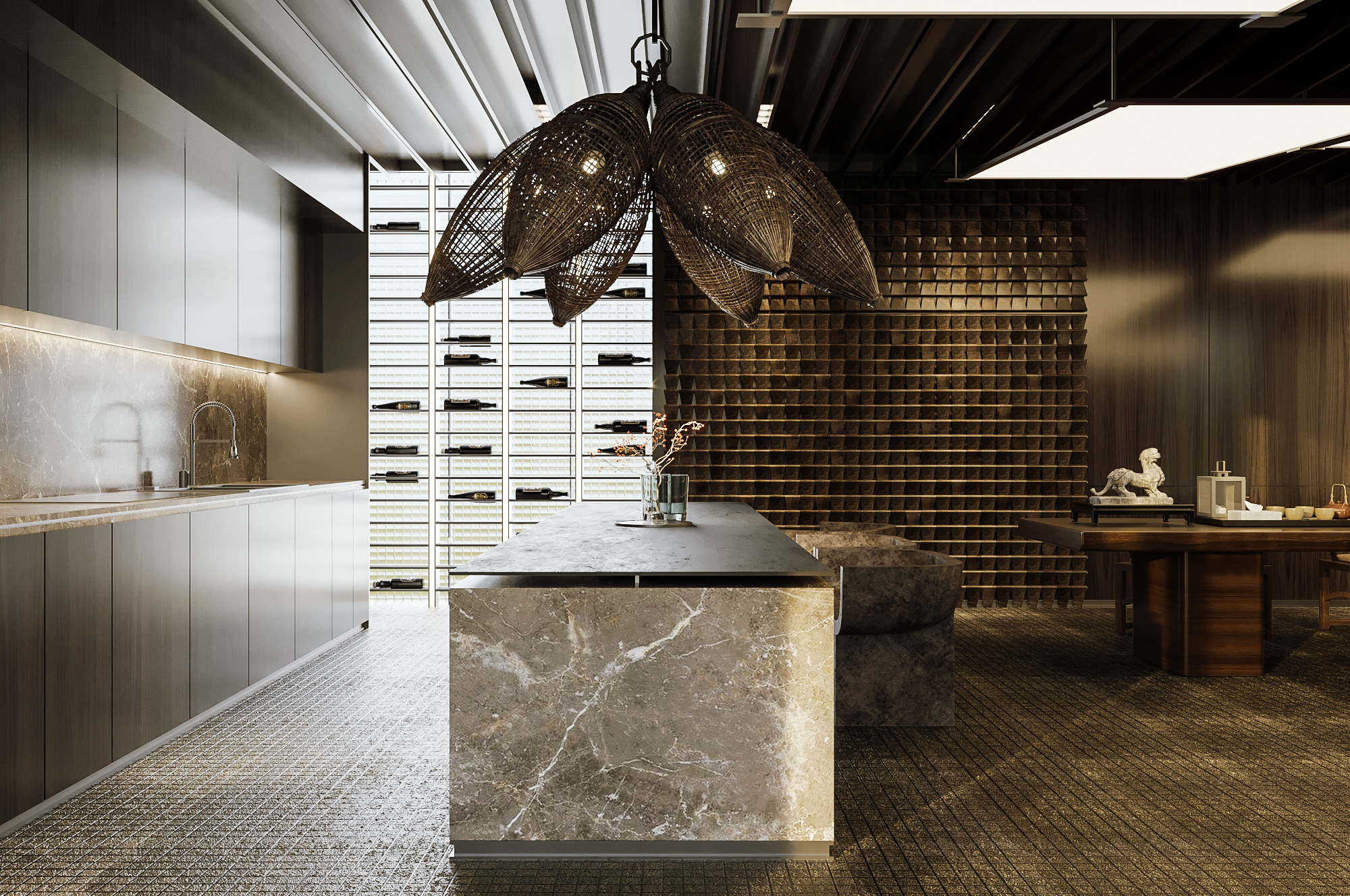 Lantai menggunakan pola grid kecil yang memberi kesan taktil dan sedikit industrial, sekaligus menyeimbangkan kemewahan marmer di area island.