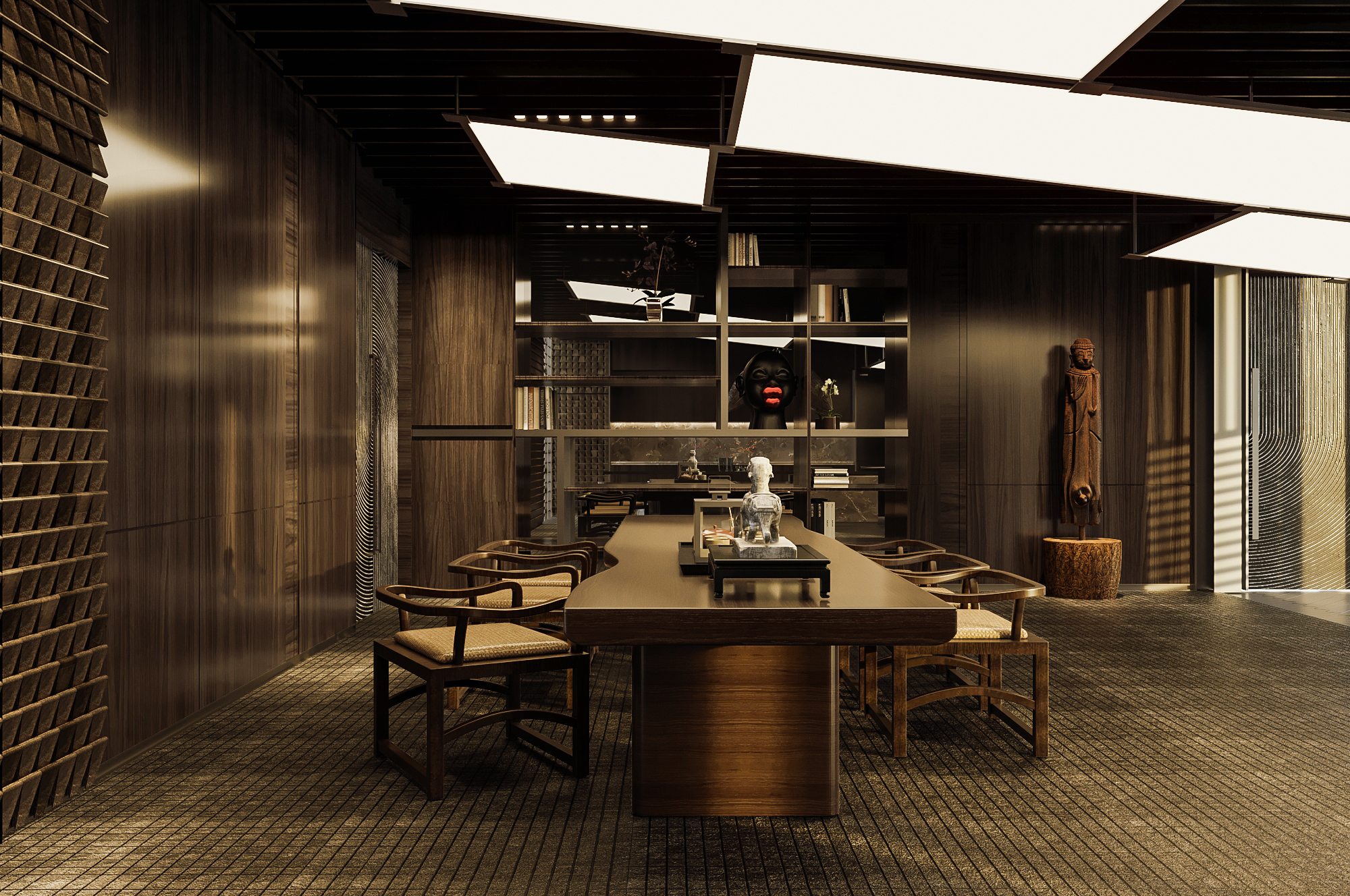 Meja panjang dengan kaki massif di tengah memberi kesan stabil dan “serius”, cocok untuk meeting kecil, tea ceremony, atau sesi tasting.